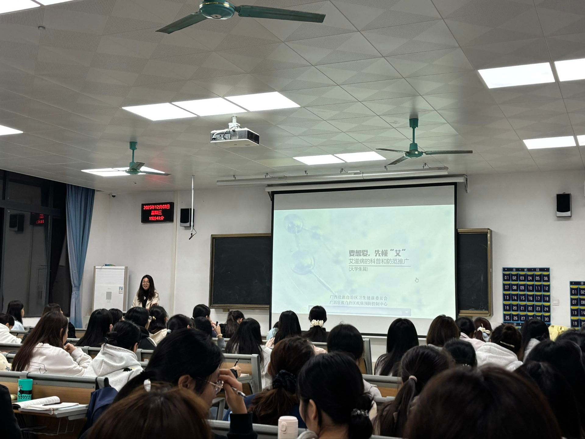 各班班主任担任班会主讲人,结合防艾宣传片中生动真实的案例,为同学们深入剖析艾滋病传播途径与防治知识,引导大家深刻认识艾滋病的成因与社会影响,树立“自身健康第一责任人”意识,强调应对艾滋病病毒携带者给予理解与关怀,共同营造无歧视、温暖包容的校园环境。班会期间,同学们还通过视频会议形式,在线聆听了南宁市疾控中心主持人与特邀医师开展的艾滋病防治专题讲座。专家通过互动问答,系统阐述了艾滋病的形成机制、常见认识误区以及大学生群体如何科学预防、感染后的正确应对措施等重要内容。