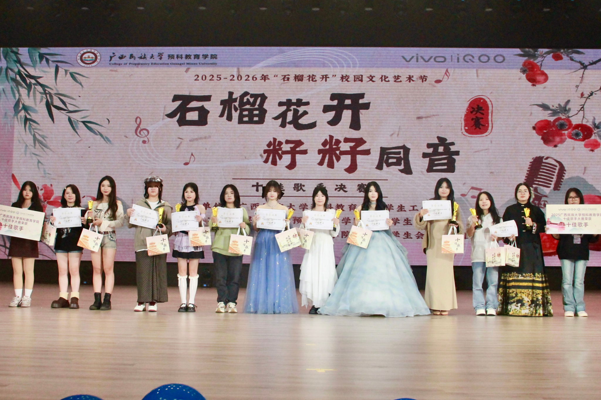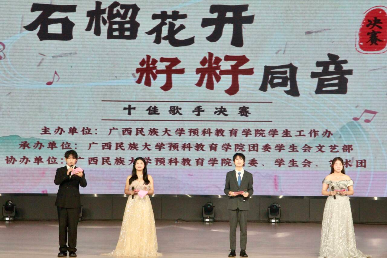 12月12日,预科教育学院2025年“石榴花开,籽籽同音”十佳歌手大赛决赛在武鸣校区大礼堂顺利举行。经过前期的选拔,共有十四名选手晋级决赛,最终十名选手凭借优异的表现荣获“十佳歌手”称号。其中,文科一班的骆芜芳歌同学凭借出色表现摘得桂冠,潘柏芝、王婧懿同学分别获亚军、季军。